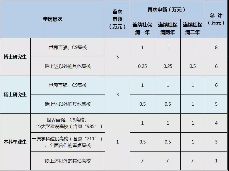 补贴由一次性生活补贴和分期安家补贴两部分组成,毕业一年内在我区用人单位就业或自主创业并缴纳社保,即可申领一次性生活补贴(下称首次申领),之后工作每满一年且在余杭连续缴纳社会保险(不含补缴)即可领取分期安家补贴,分三年领取(下称再次申领)。具体标准为:
