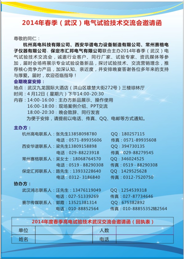 2014年春(武汉)电气试验技术交流会于2014年4月12日,如期在武汉九龙大酒店一楼大厅隆重举行!由杭州多多28科技有限公司、西安华谱电力设备制造有限公司、常州赛格电子仪器有限公司、保定市汇邦电气有限公司作为主办单位,联合武汉鸿志电气及赛尔传媒资讯,与武汉及外地远道而来的同行、用户,充分的进行了交流!现将会展实录以下采用文字和图片的方式予以报道。