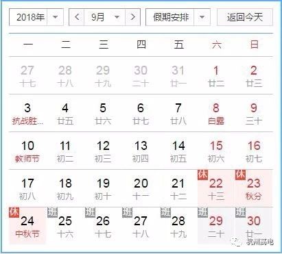 【中秋节】:9月22日(周六) - 9月24日(周一) 放假三天,9月25日(周二) - 9月30日(周日) 正常上班六天